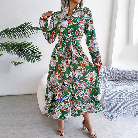 Tropical Floral Print Belted Shirt Maxi Dress Long Sleeve